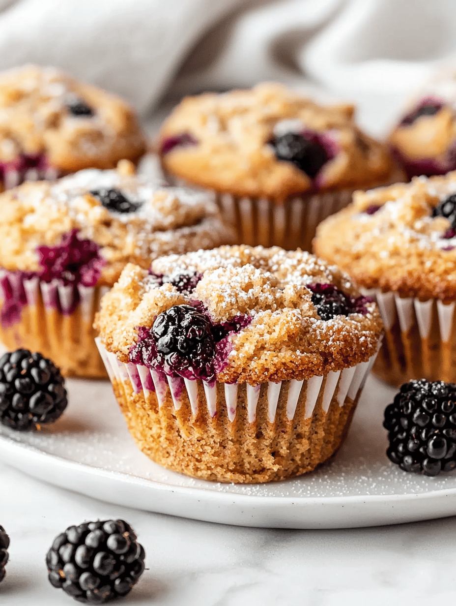 Blackberry Sour Cream Muffins are tender, moist baked treats made with fresh blackberries and enriched with sour cream for a rich, creamy texture. The muffins have a golden crust with vibrant berry bursts inside, creating a balance between tartness and sweetness with a soft crumb and slightly crispy top.