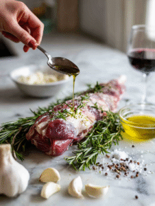 Step 2: Rub the lamb generously with a mixture of crushed garlic, rosemary, salt, and black pepper.