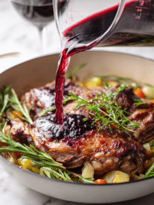 - Pour red wine into the pan, letting it bubble up and loosen any flavorful browned bits from the bottom.