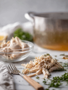 - Once cooled enough to handle, shred the chicken meat into bite-sized pieces, discarding bones and skin. Return the shredded chicken to the strained broth, ensuring it’s evenly distributed.