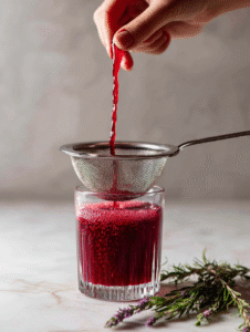 - Strain the mixture through a fine mesh strainer into the chilled glass, capturing the vibrant red color and aromatic bubbles.