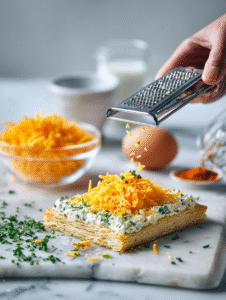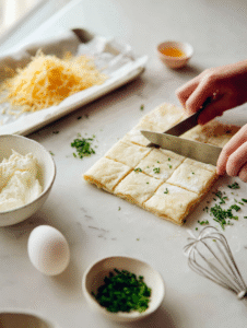 - Sprinkle shredded cheddar cheese evenly over the cheese-filled pastry squares to add a melty, crispy topping.