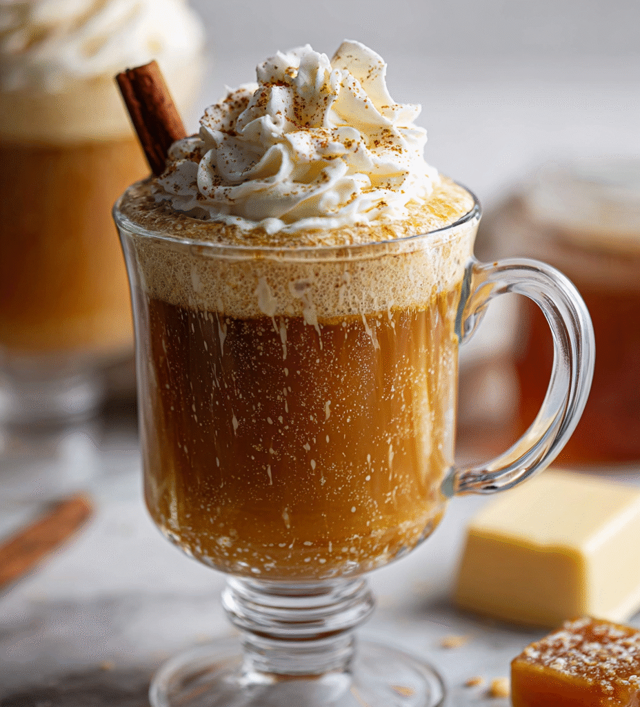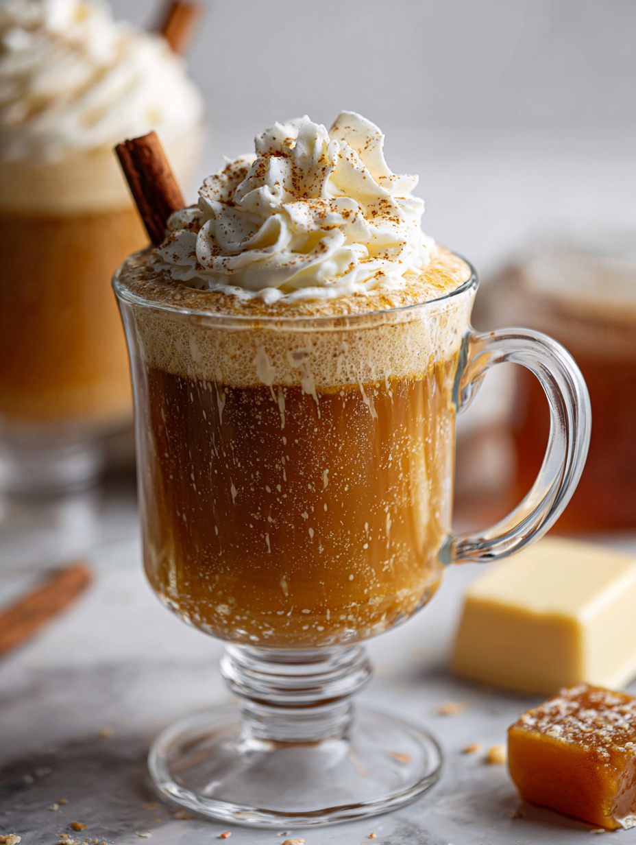 - Remove the saucepan from heat and ladle the hot buttered rum into warm mugs, filling them generously.