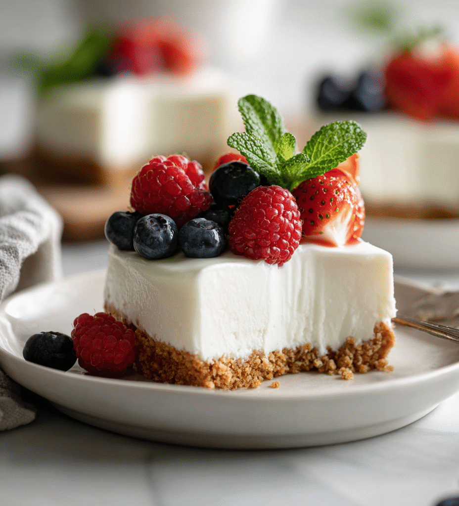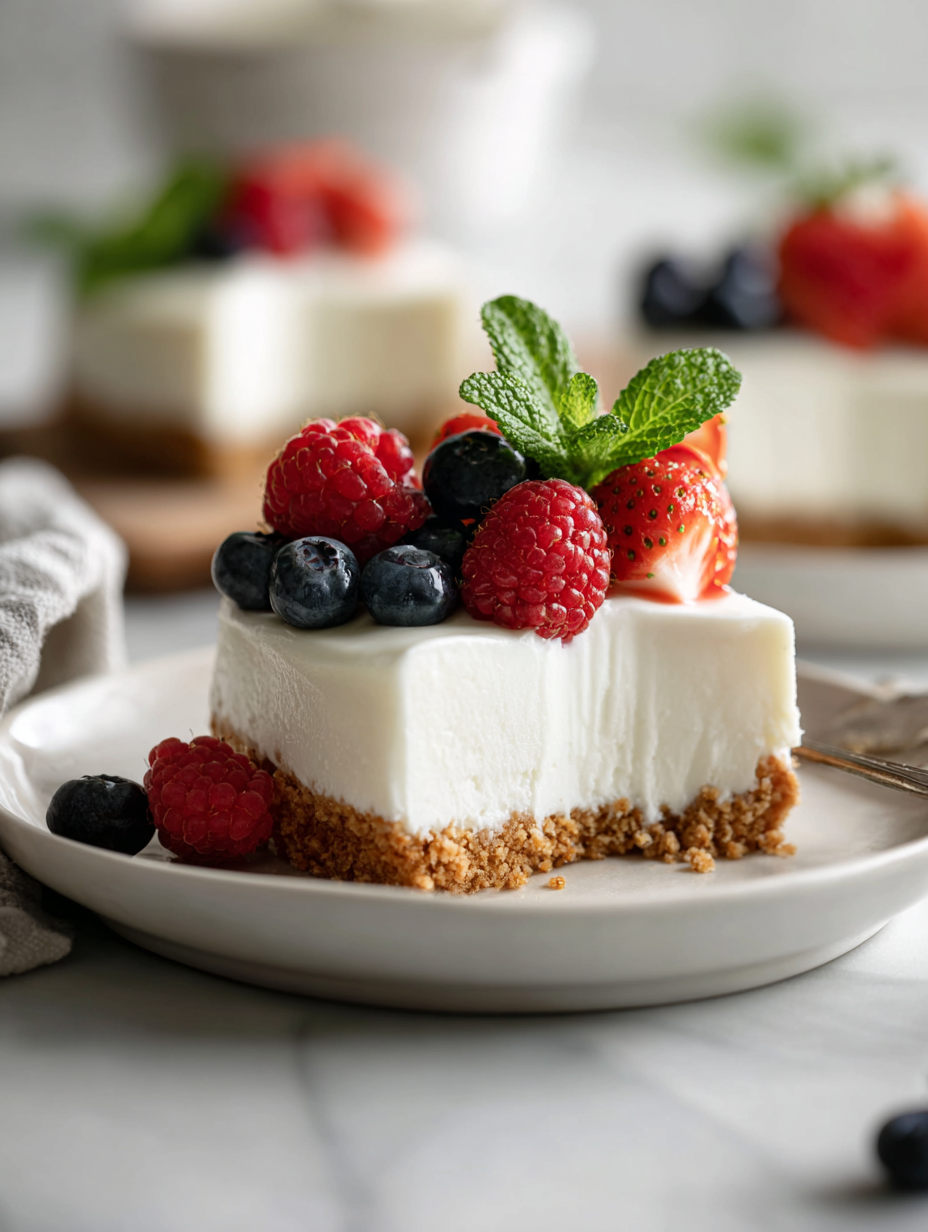 - Garnish with fresh berries, mint, or a dusting of powdered sugar if desired. Slice and enjoy this creamy, tangy dessert!
